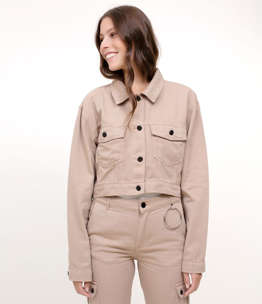 Jaqueta de Sarja Feminina Cropped com Bolsos Bege - cea