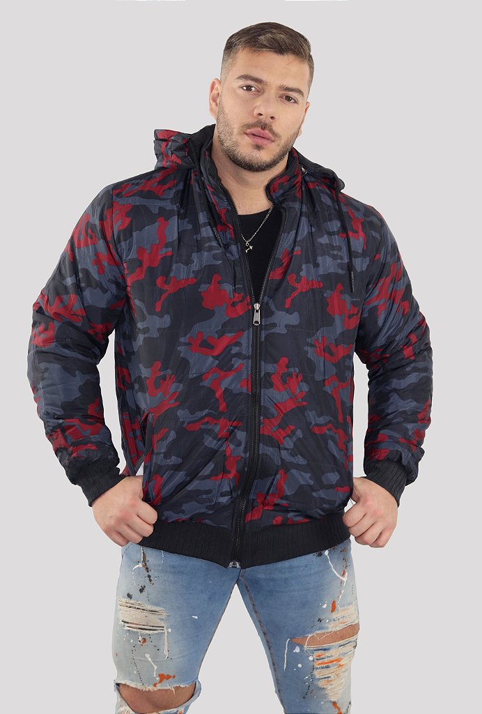 jaqueta puffer masculina dupla face capuz removível - preta/vermelha - DAZE MODAS jaqueta puffer masculina vermelha