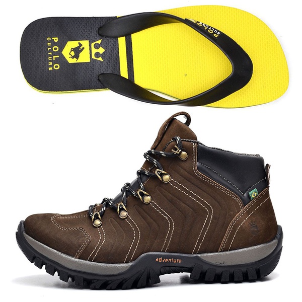 Kit Bota Adventure Polo Culture e Chinelo Sandália Conhaque | Top Franca Shoes | Calçados confortáveis em Couro bota sandália